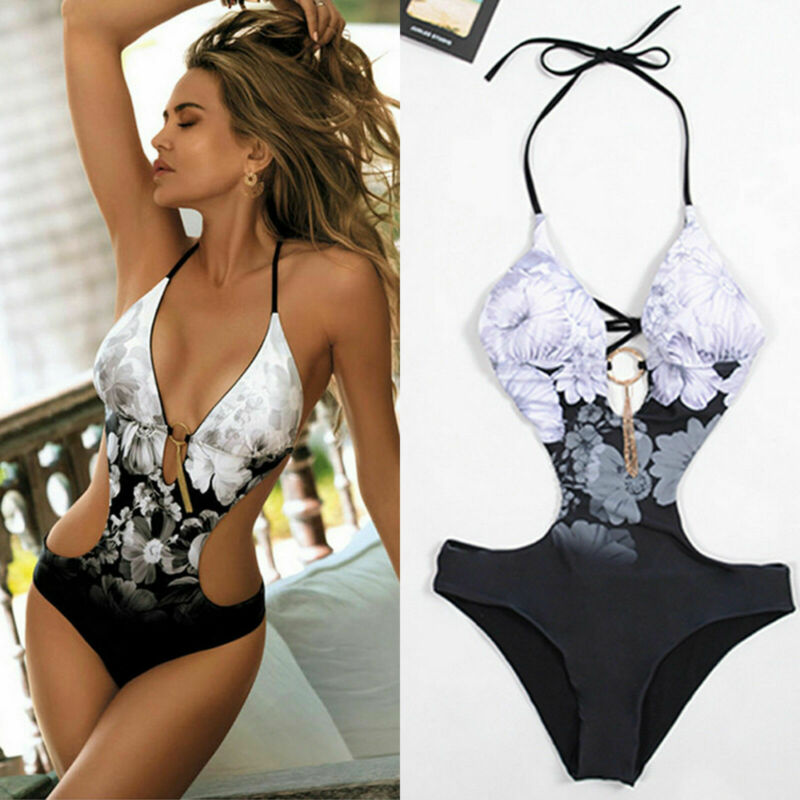 One Piece Bikini Push-up Padded Swimsuit Floral Print Halter Polyester Bathing Swimwear Beach Monokini