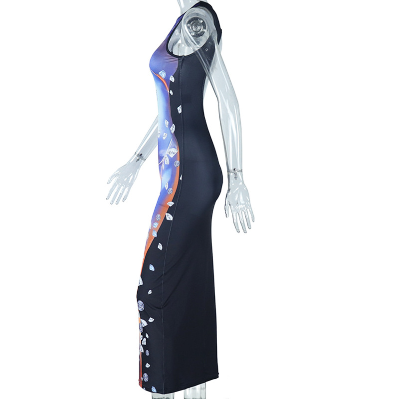 Mid Length Tight Dress Street Hipster Hollow Out Cutout round Neck Hip Pullover Print