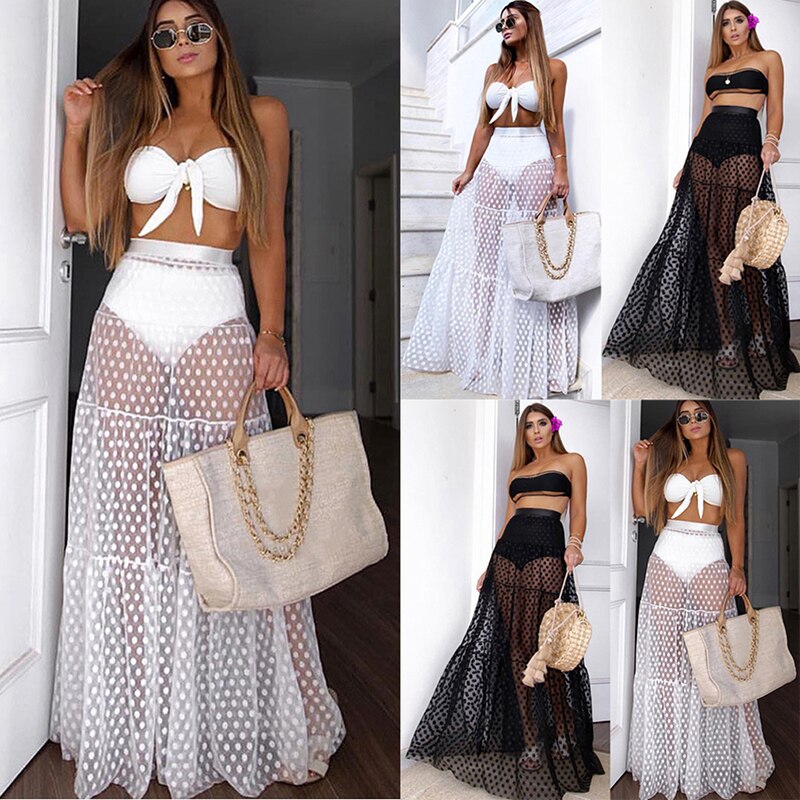 Sexy Beach Skirt Women Cute Dot Dress Bikini Cover Up 2022 High Waist Transparent Long Maxi Skirts Chiffon Femme Swimwear Dress