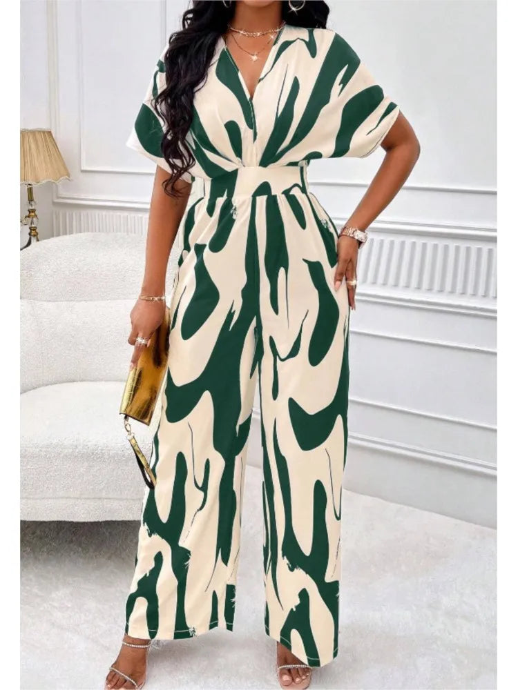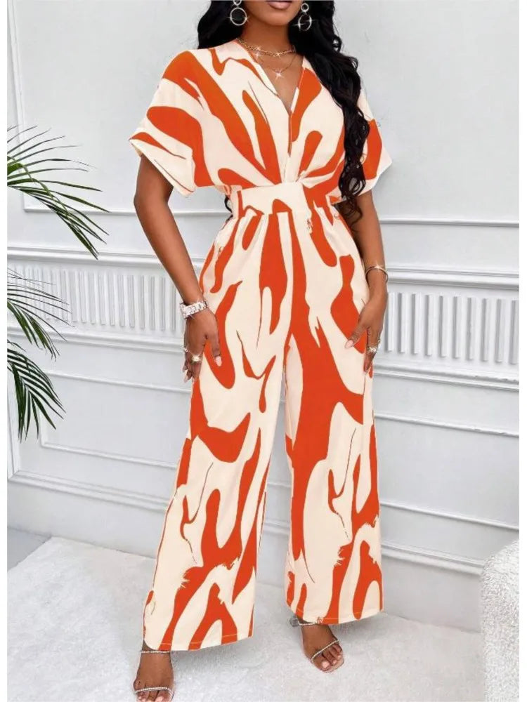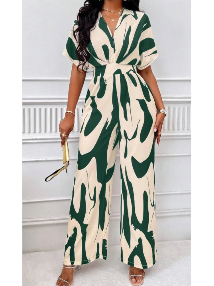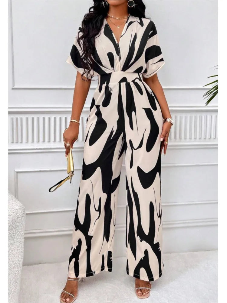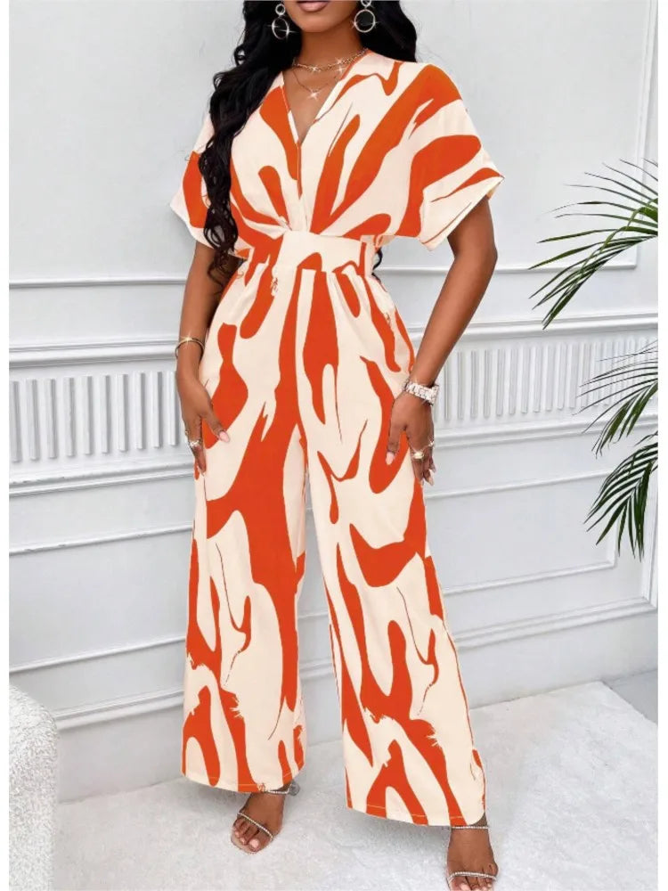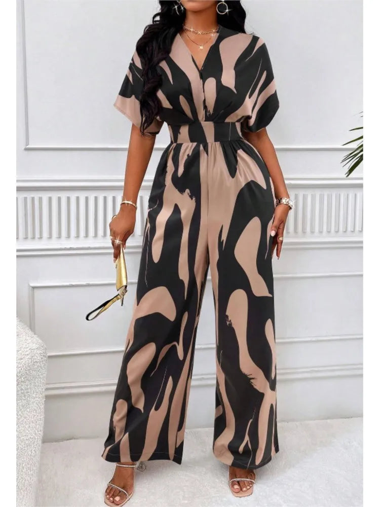 Sexy sleeveless women's V-neck jumpsuit, elegant suit with tight fitting print, one-piece, suitable for spring/summer 2024