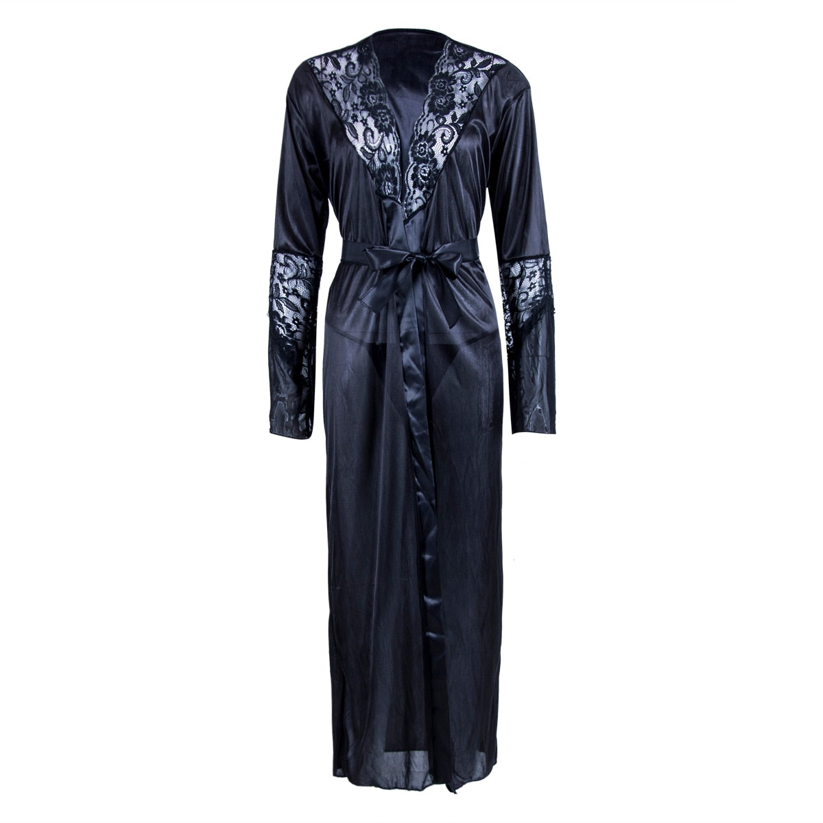 Satin Silk Lace Patchwork Gown Bathrobes G-string Long Nightdress Lingerie Kimono Robe with Belt