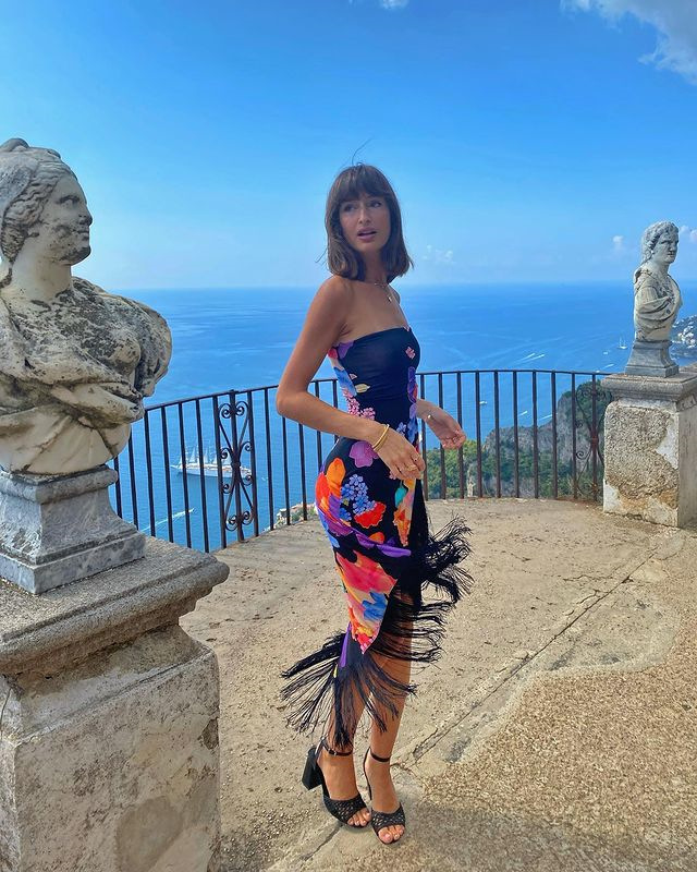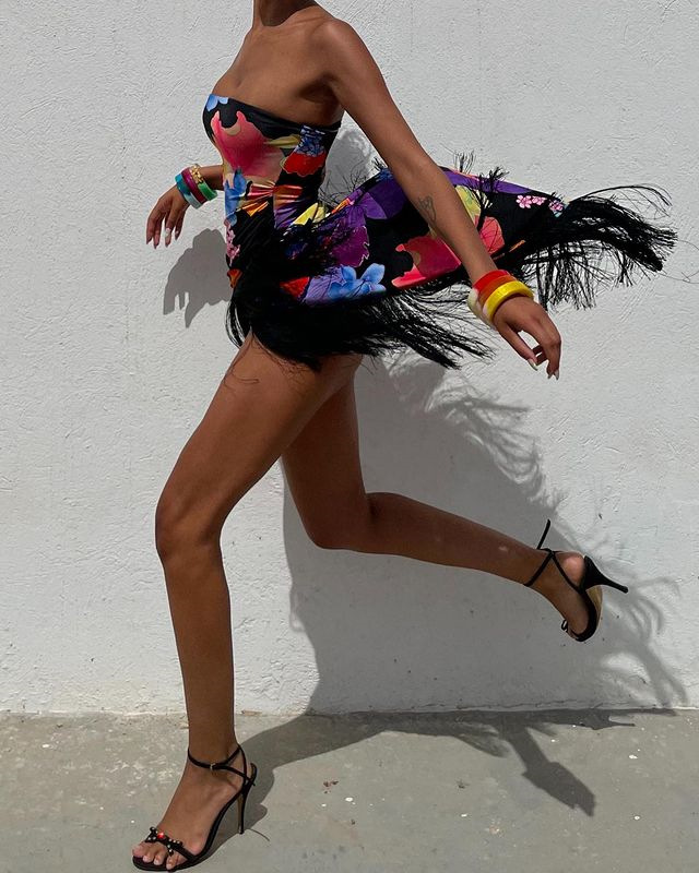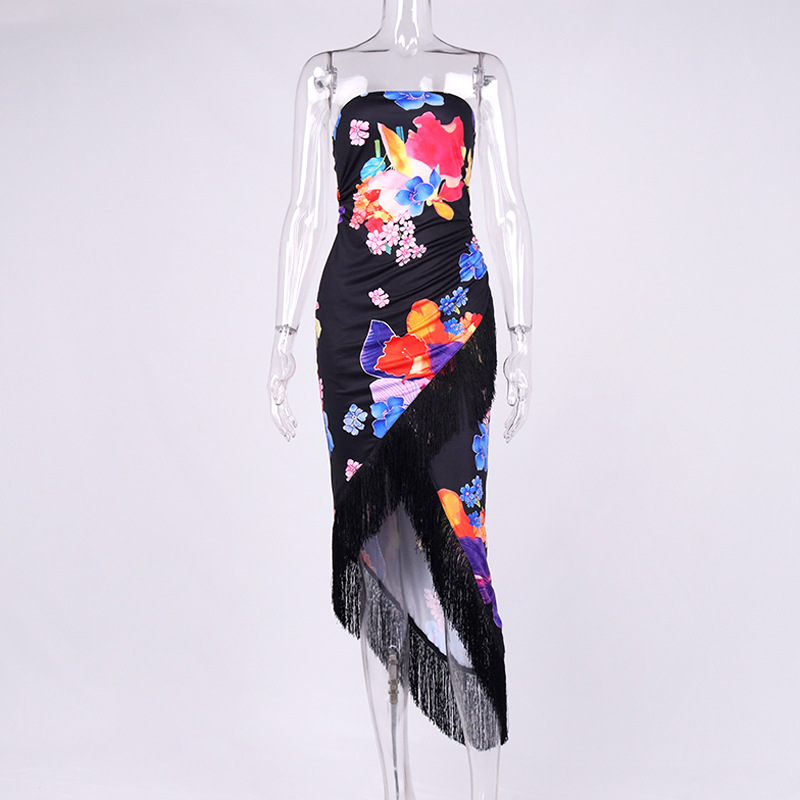 Spring And Autumn Women Sexy Party Print Tassel Split Wrapped Chest Dress Female