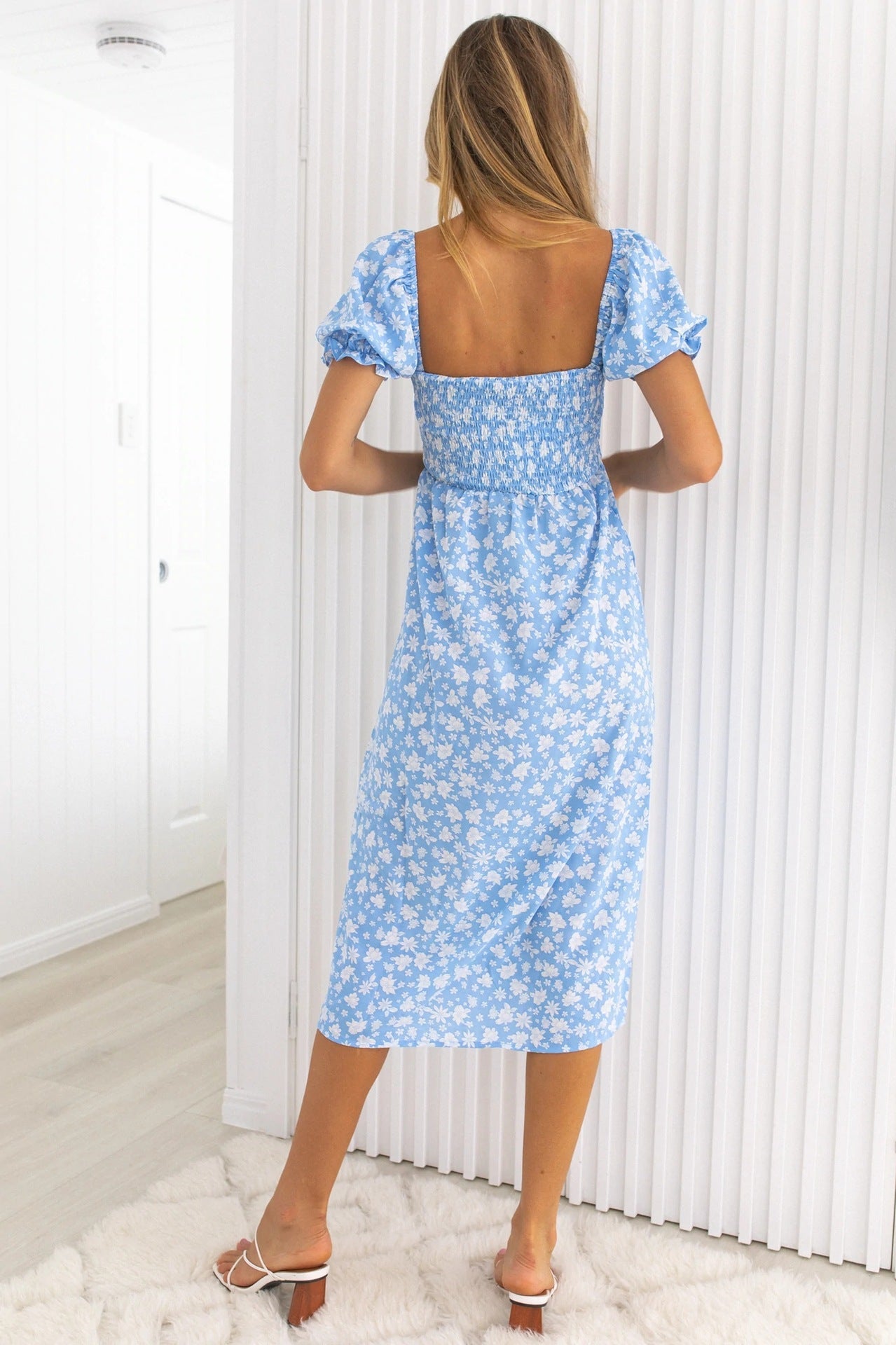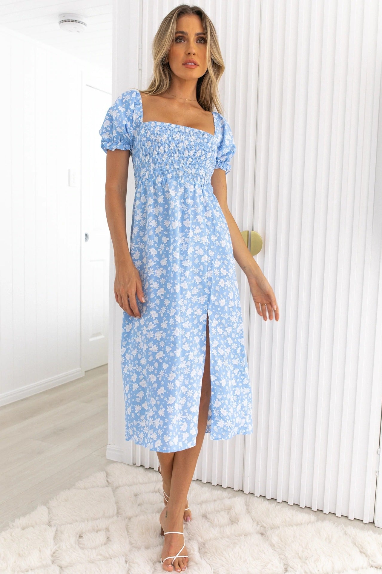 Spring Summer Square Collar Floral Tight Waist Split Dress for Women