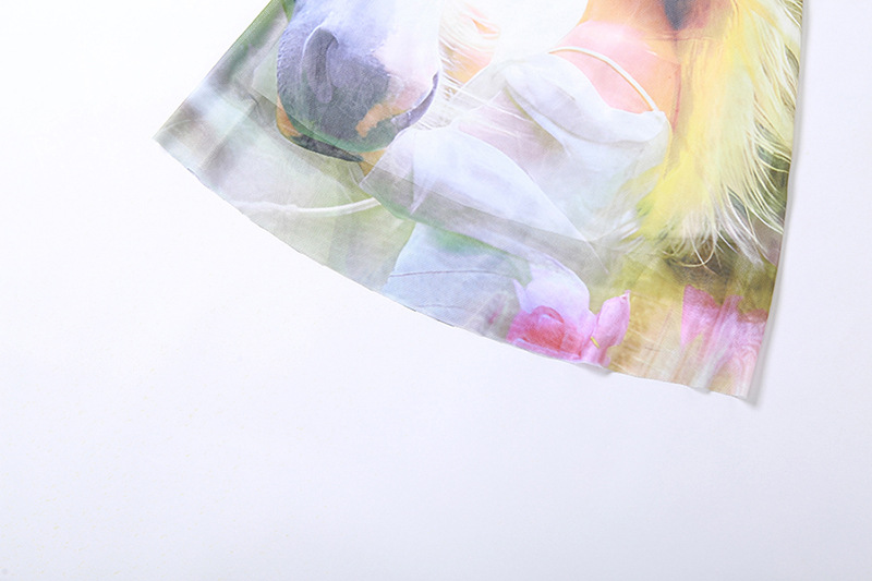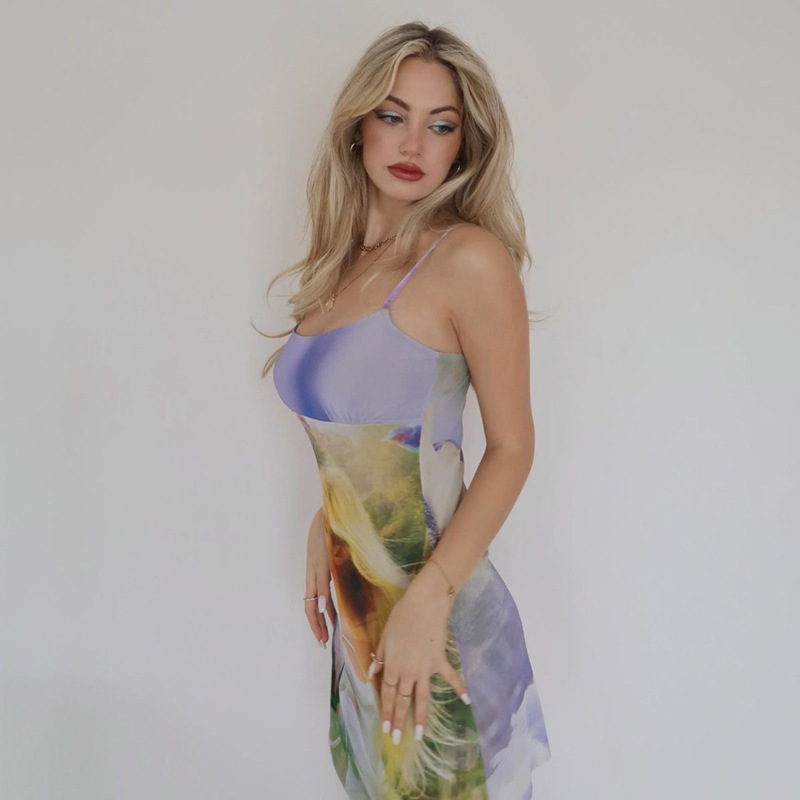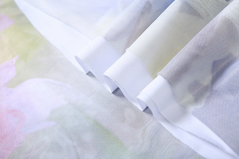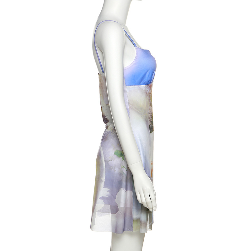 Spring Women Clothing Suspender Off Shoulder Mesh Floral Print Stitching Dress