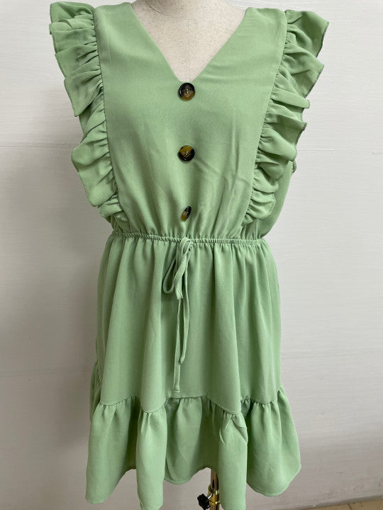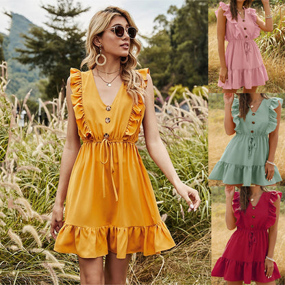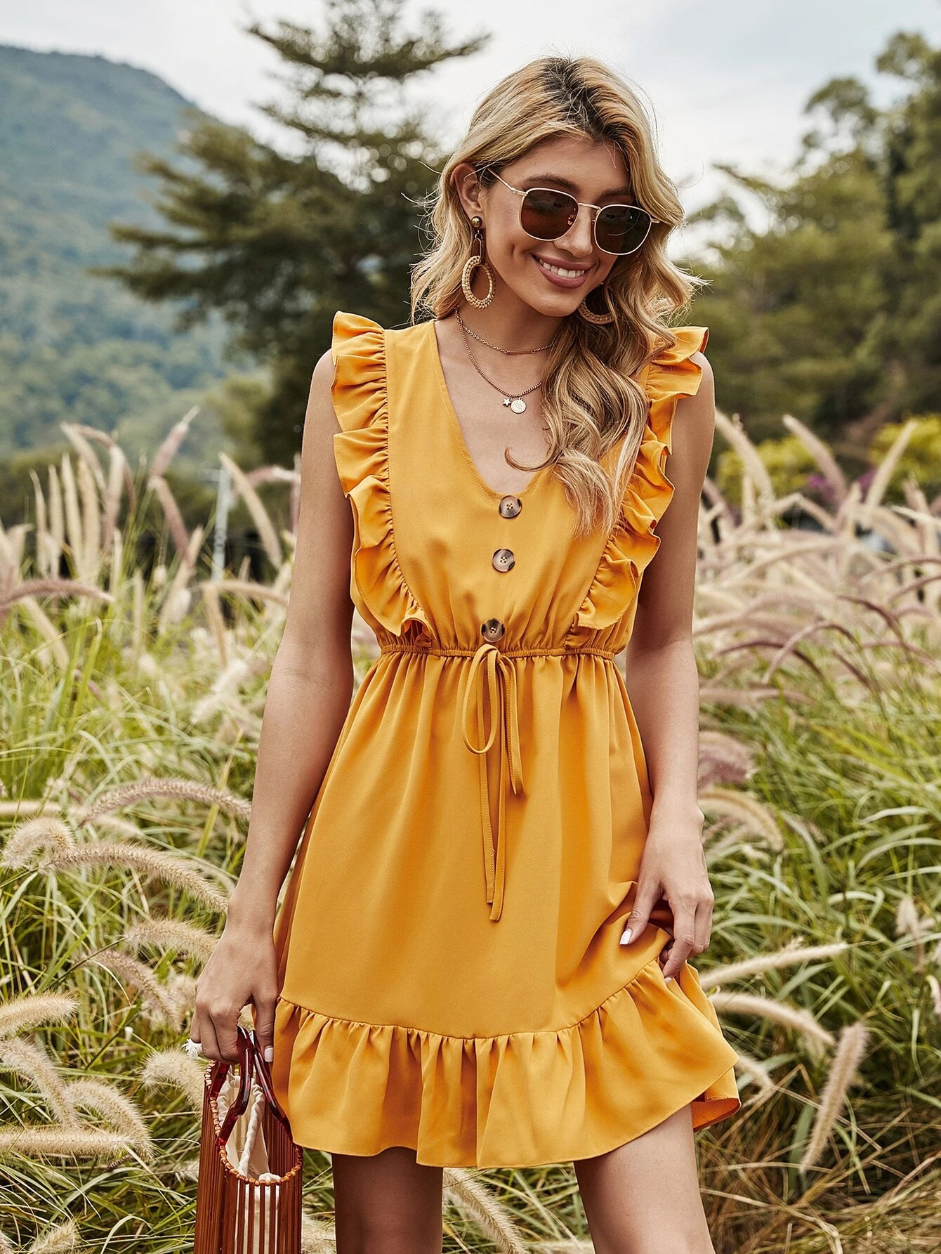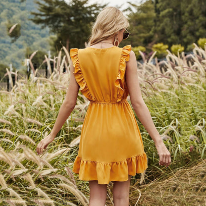 Summer New Yellow V-neck Flounce Bubble Lace-up Dress for Women