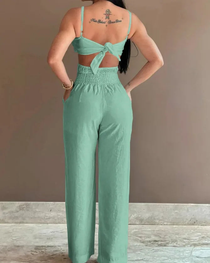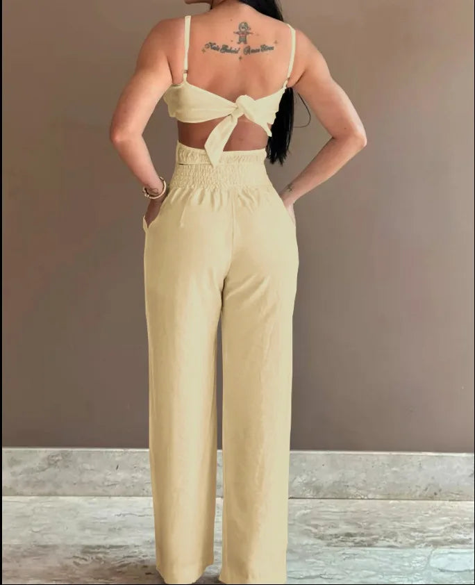 Summer Spaghetti Strap Fashion Jumpsuit New Women Floral Pattern Shirred Hollow Out Casual Asymmetricsal Neck Backless Jumpsuits