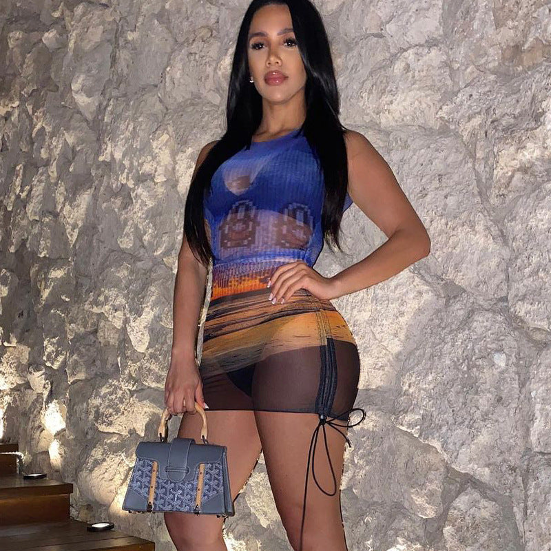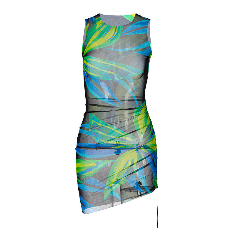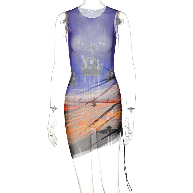 Women 2021 New Spring Fashion Sexy Mesh Floral Print Drawstring Dress Female