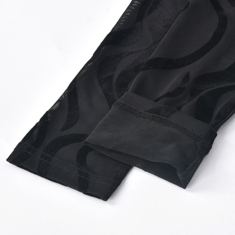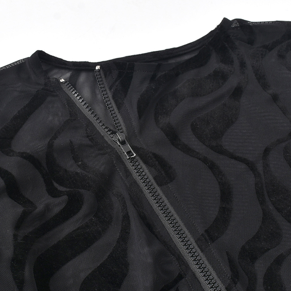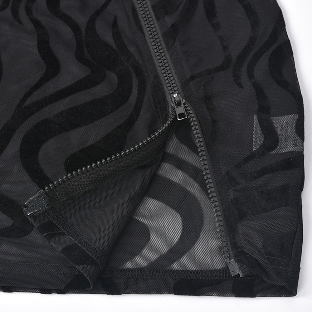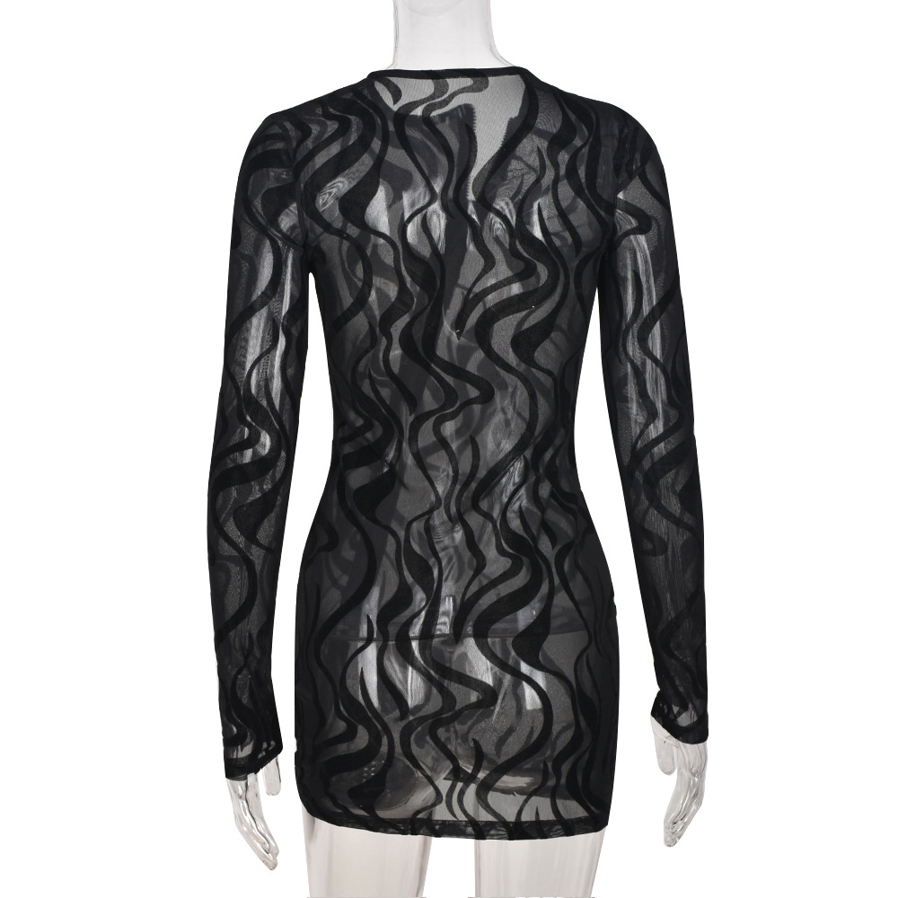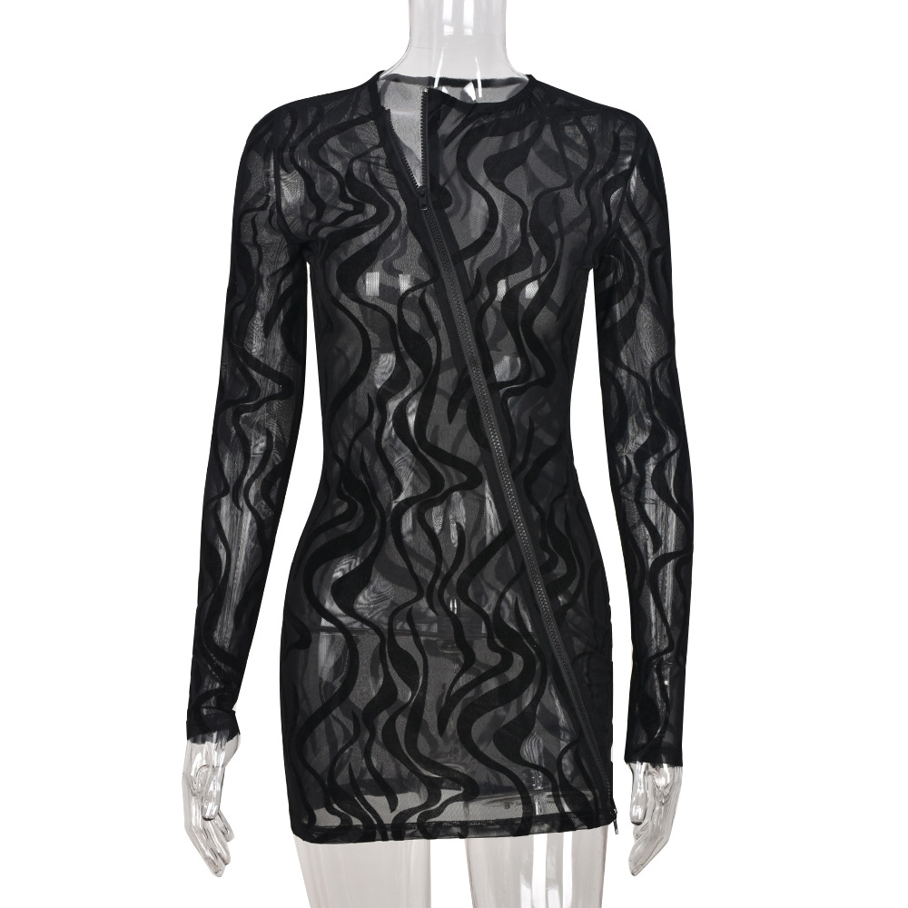 Women Clothing 2022 Spring Summer Sexy Mesh See-through Zipper Flocking Long-Sleeved Dress for Women