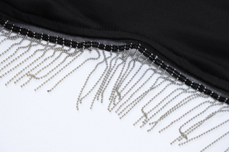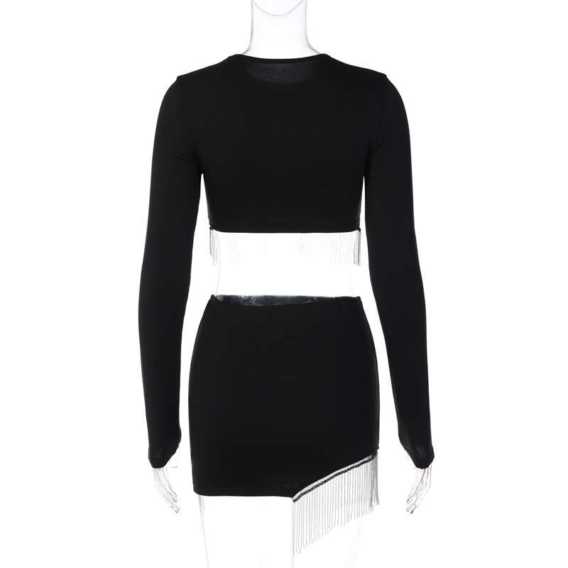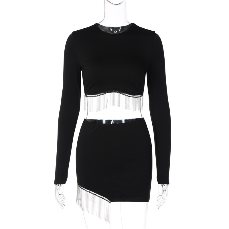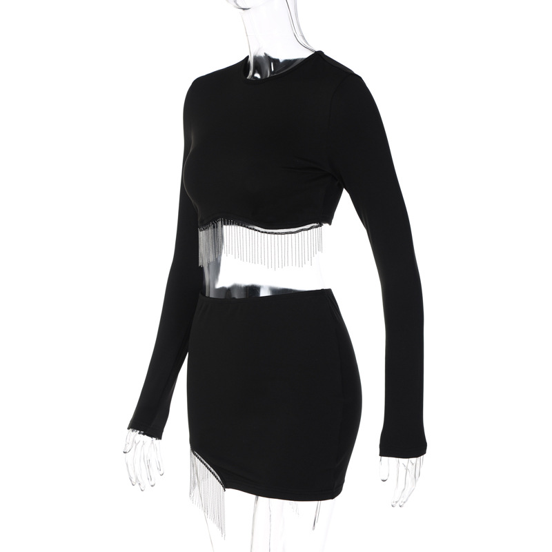 Women Clothing Autumn Winter Street Long Sleeves Cropped Tassel Top Skirt Set