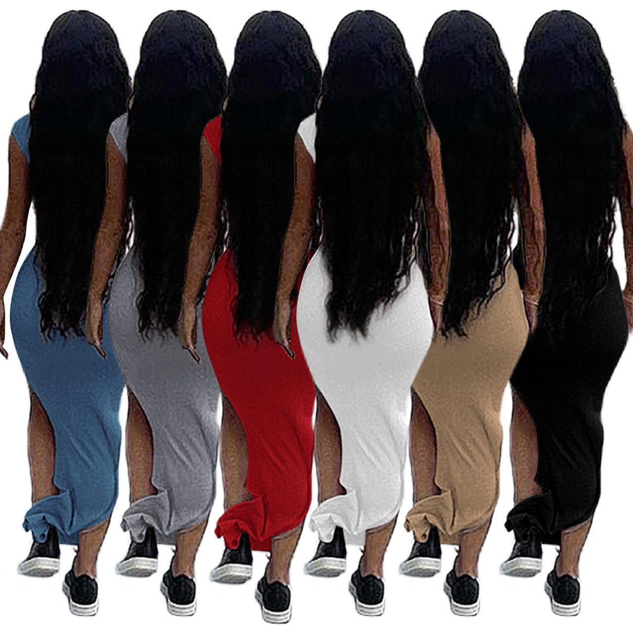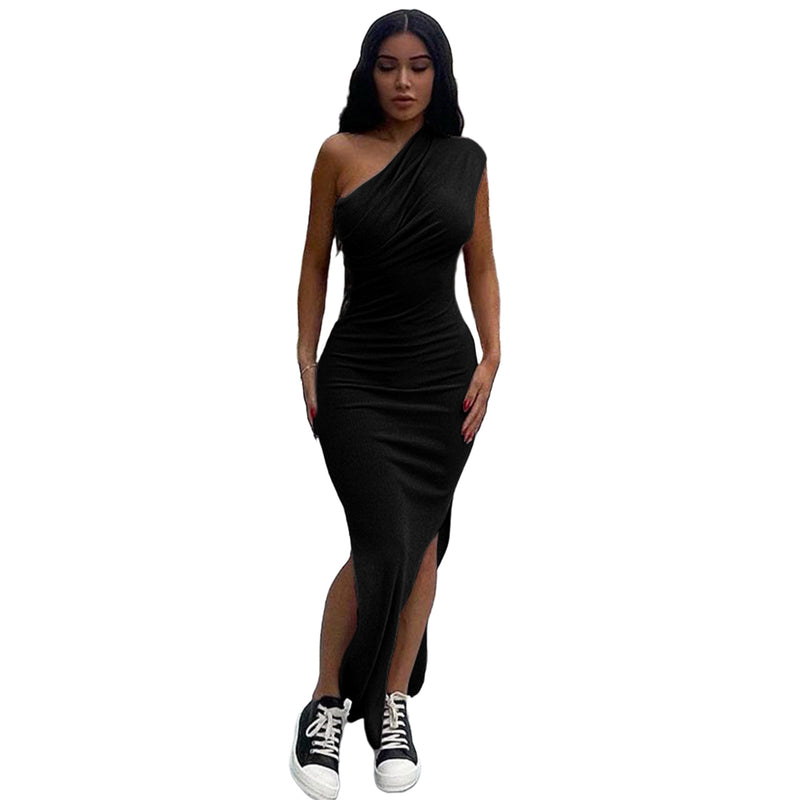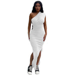 Women Clothing New Spring Summer Solid Color Thread Pleated Slant Shoulder Slit Long Dress