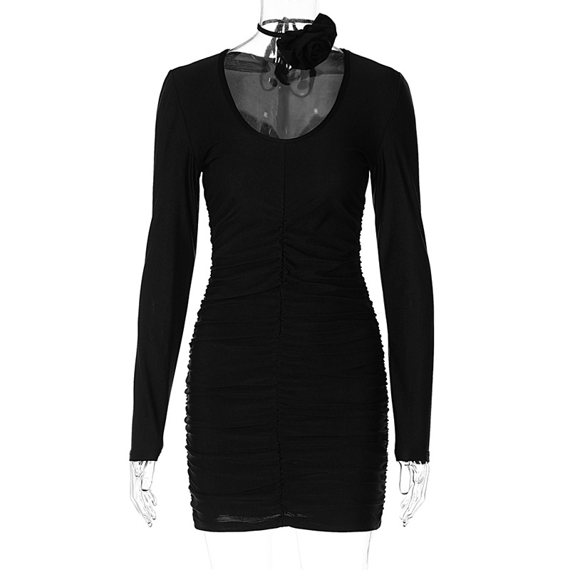Women Clothing Winter U Collar Slim Pleated Solid Color Long Sleeve Narrow Dress