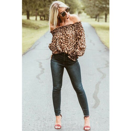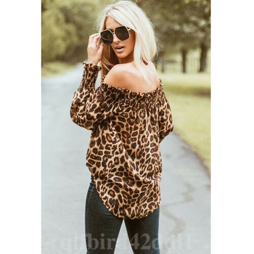 Leopard Print Long Sleeve Off Shoulder Blouses