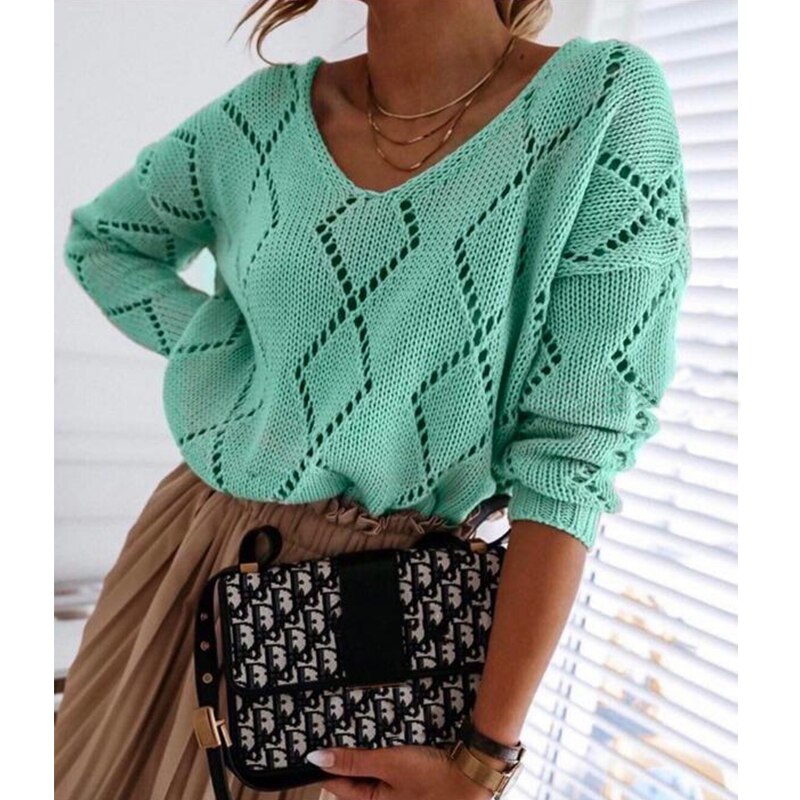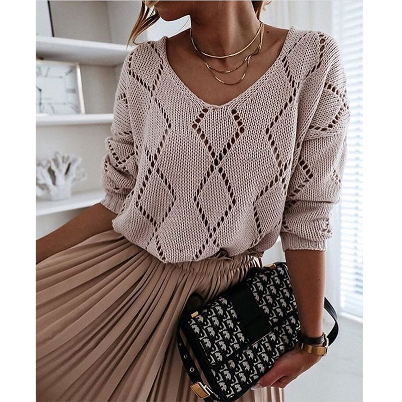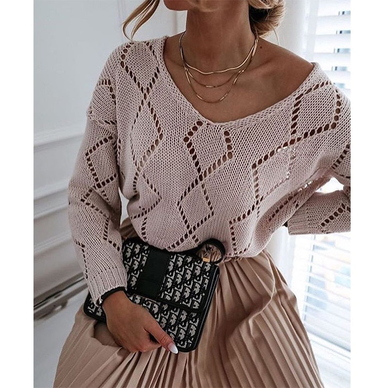 Women Long-sleeved Knit Sweaters Office Lady V-Neck Hollow Loose Jumper Pullovers