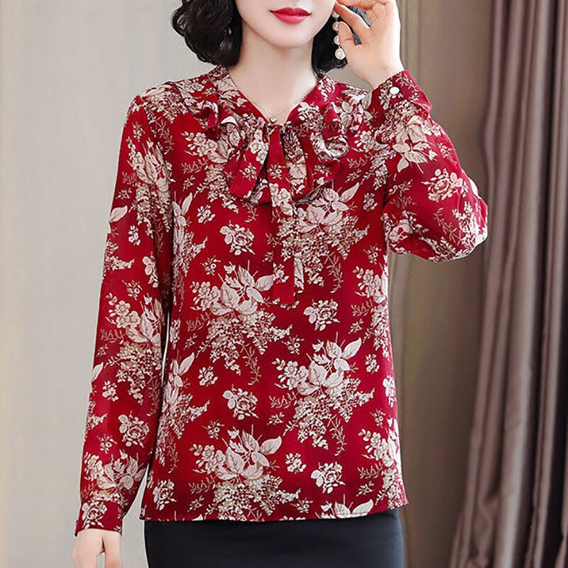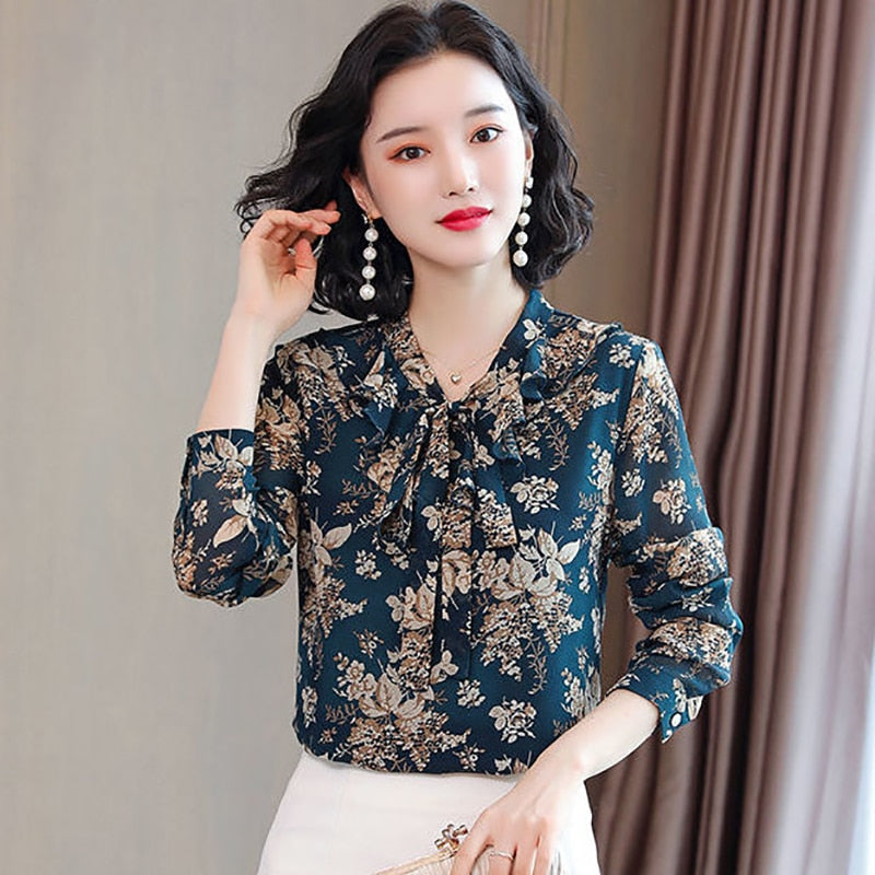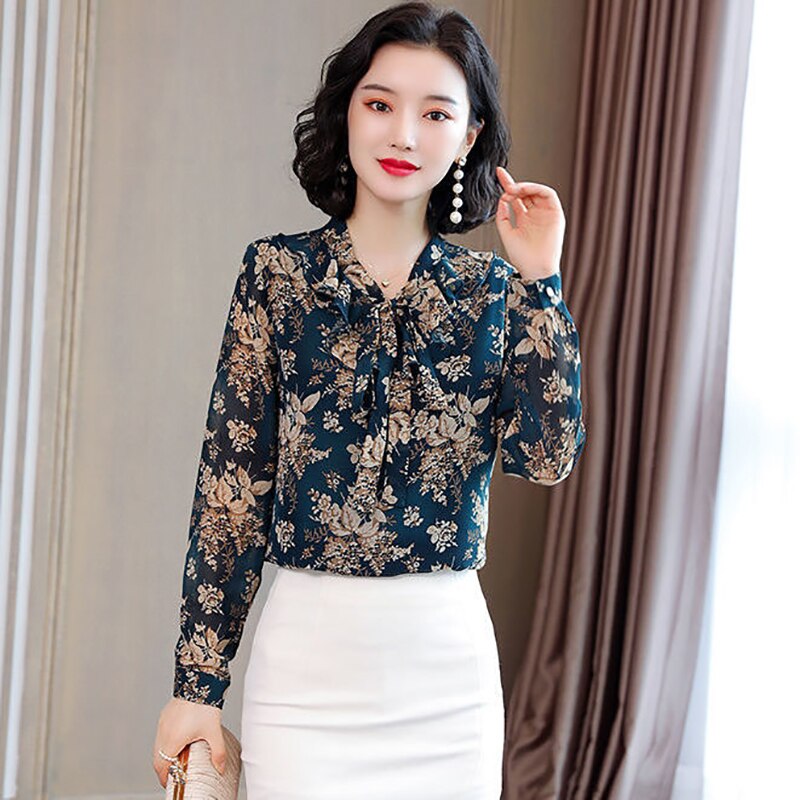 Chiffon Blouses Shirts Lady Casual Long Sleeve Bow Tie Collar Printed Blouse