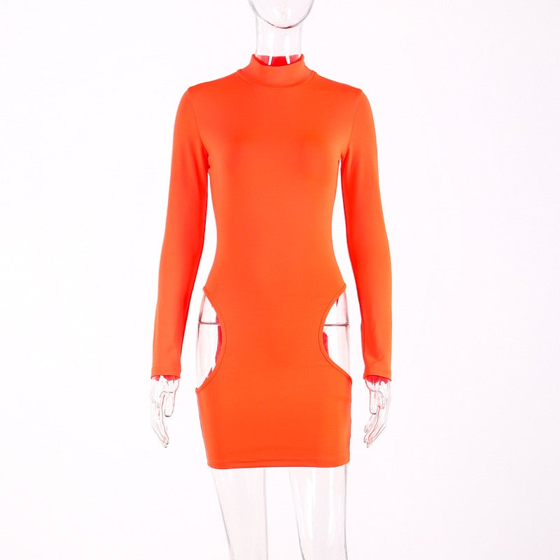 Women Summer Fluorescent Bodycon Mini Dress Cutout Long Sleeves Sexy Hollow Streetwear Party Dresses Female Clothing